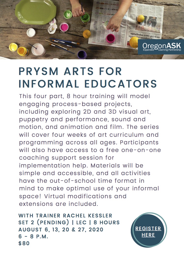 Training Series Description: This training is an eight hour series being provided in four parts over four weeks. As a whole, the series will cover four full weeks of art curriculum and programming for children of all ages. This comprehensive arts training will model process based, fun, and engaging projects that will give you everything you need to explore 2D and 3D visual art, puppetry and performance, sound and motion, as well as animation and film. The training will also provide practice for authentic, culturally responsive and youth-centered engagement strategies. After training completion, participants will receive the full four week curriculum with extensions to keep your art program fun and exciting for youth into the future. Training participants will also have access to a free one-on-one coaching support session to help you work toward your goals for implementing art. Materials will be simple and accessible, and all activities have the out-of-school time format in mind to make optimal use of your informal space! Virtual modifications and extensions are included.