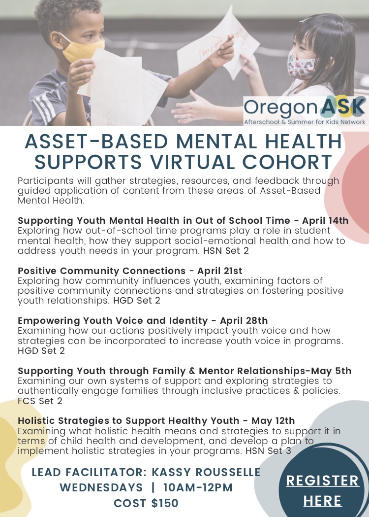 This 5 consecutive week virtual series will provide time and space for afterschool professionals to explore and apply strategies from the breadth of mental health resources. The series will incorporate asset-based approaches from 40 Developmental Assets and Whole School, Whole Community, Whole Child (WSCC) frameworks that emphasize strategies most applicable to afterschool & summer programs.