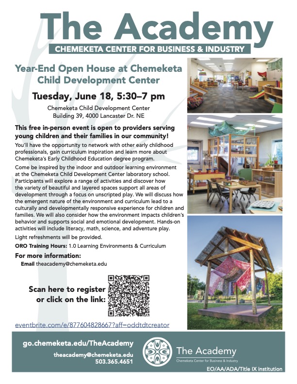 You'll have the opportunity to network with other early childhood professionals, gain curriculum inspiration and learn more about Chemeketa's Early Childhood Education degree program.